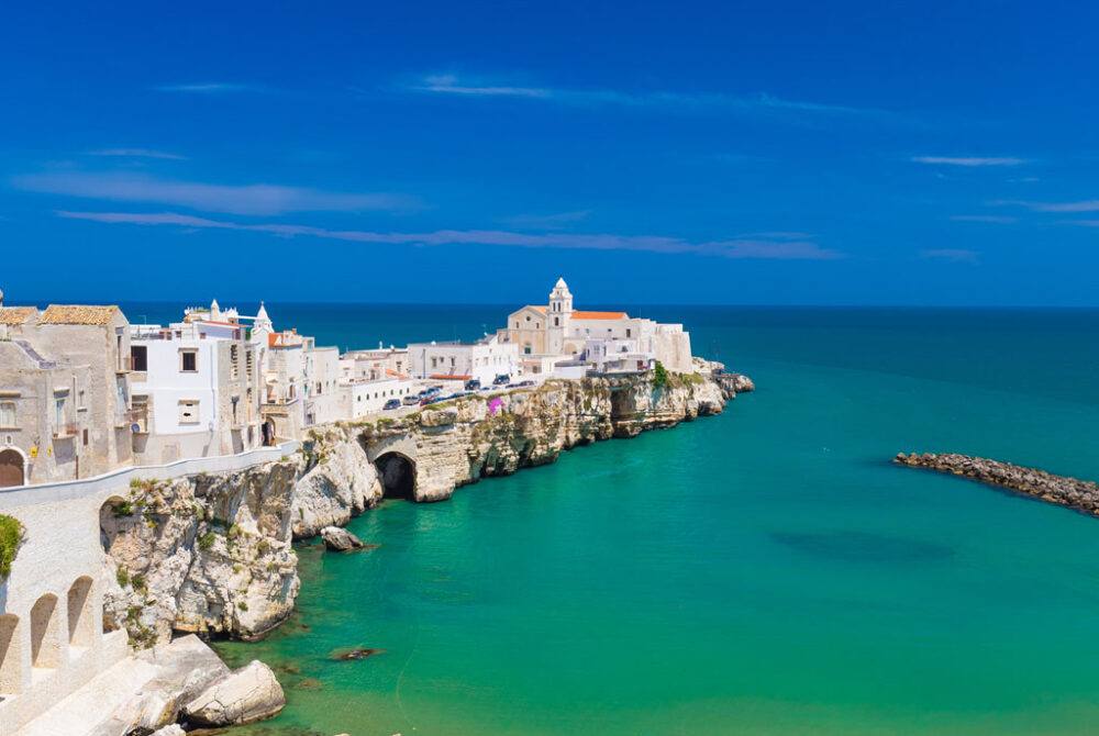 . Vieste – la “Perla del Gargano”, con un centro storico bianco e panorami mozzafiato sulle scogliere. Il Pizzomunno, il famoso monolite sulla spiaggia, è simbolo della città.